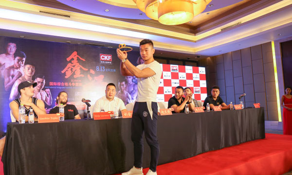 7月16日上午,由中央电视台体育频道鑫江集团主办,青岛鑫江体育文化传播有限公司与北京原野兄弟影视传媒有限公司承办的2016 CKF鑫江国际综合格斗争霸赛在青岛鑫江温德姆酒店举行了首次新闻发布会,会上宣布赛事将于8月13日在青岛市城阳区体育馆名锣开战。本次赛事是由鑫江国际综合格斗争霸赛与国内著名MMA组织CKF联合举办,鑫江集团副总经理赵文博、CKF形象代言人中国散打王赵子龙、CKF鑫江国际综合格斗争霸赛赛事总监刘金文、奥运散打冠军蔡良蝉、中国MMA新星张名扬、